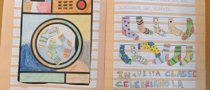 Im Laufe des Tages setzten sich die Klassen mit altersgerechten Aktivitäten mit dem Thema auseinander. Die Kinder der Vorschule gestalteten eine Pinnwand mit bunten Socken und verwandelten sie in ein kleines visuelles Manifest der Vielfalt. Die Kinder der 2C haben ihre Socken in bunten Waschmaschinen durcheinandergewirbelt und ein Gedicht vorgetragen. In den anderen Klassen wurde mit Gedichten, Geschichten, Kurzfilmen und Gesprächsrunden gearbeitet, wodurch gemeinsame und aktive Reflexionsmomente entstanden.